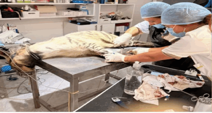 وللتعامل مع حالته الحرجة، تم نقل الحيوان إلى مصحة بيطرية مختصة، حيث أجرى فريق الأطباء البيطريين عملية جراحية معقدة لإصلاح الأطراف التالفة وإنقاذ حياته.