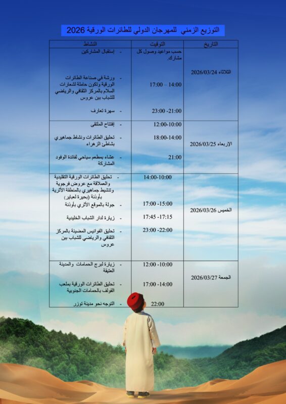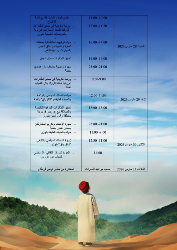 انعقدت يوم الخميس 12 مارس 2026 الندوة الصحفية الخاصة بالمهرجان الدولي للطائرات الورقية الذي ينظمه المركز الثقافي والرياضي للشباب ببن عروس بالشراكة مع المركب الشبابي بنفطة و الجمعية التونسية للطائرات الورقية “One Tunisia Kite Team” والديوان الوطني التونسي للسياحة و بالتعاون مع المندوبية الجهوية للشباب والرياضة ببن عروس و دور الشباب حمام الأنف الزهراء الخليدية و المتنقلة بن عروس ( من 24 الى 31 مارس 2026 ) تحت إشراف وزارة الشباب والرياضة التونسية والحي الوطني الرياضي.