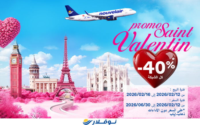 تعلن نوفلار عن إطلاق عرض ترويجي خاص يمكّن حرفائها من تخفيض ب 40% على سعر التذاكر ذهابا وايابا دون احتساب الأداءات ويشمل كامل الخطوط المنتظمة على شبكتها وذلك بمناسبة عيد الحب.