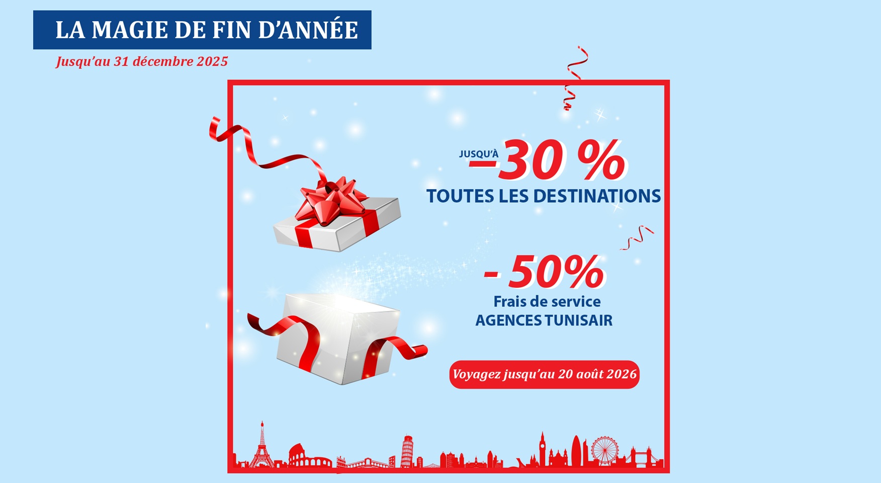 بمناسبة احتفالات نهاية السنة، تطلق الخطوط التونسية حملتها الترويجية الجديدة تحت عنوان «سحر نهاية السنة»، داعية حرفاءها إلى التخطيط المسبق لرحلاتهم ابتداءً من الآن وإلى غاية 31 أوت 2026، وذلك على كامل شبكة رحلاتها من وإلى تونس.
